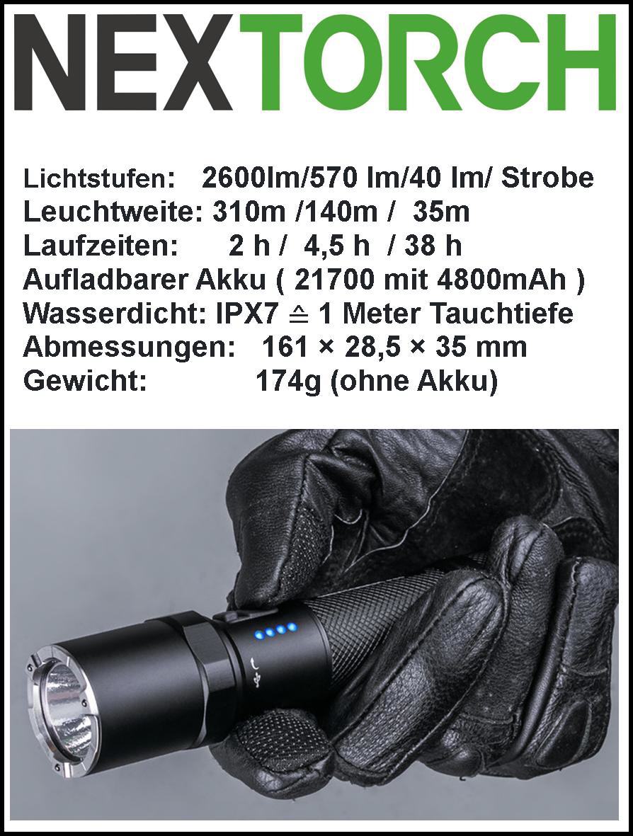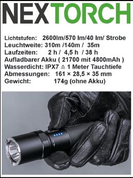 Die NEXTORCH P81 überzeugt in erster Linie durch ihre einfache Bedienung, ihre starke Leuchtleistung von 2.600 Lumen und einem hochwertigen Akku. An der Linsenkrone hat diese Einsatzlampe Kugeln aus diamantharter Keramik - einem der wirkungsvollsten und sichersten Glasbrecher der Welt. Diese robuste LED-Taschenlampe ist selbstverständlich absolut wasserdicht und stoßfest. Dank der verbauten LED der neusten Generation erreicht die NEXTORCH P81 eine maximale Leuchtweite von erstaunlichen 310 Metern. Das Gehäuse besteht aus Luftfahrt-Aluminium, was diese leistungsstarke Taschenlampe angenehm leicht und widerstandsfähig macht. Der langlebige Li-Ionen-Akku leistet in der höchsten Leuchtstufe ( 2600 Lumen ) volle 2 Stunden Laufzeit. Gedimmt sind sogar 38 Stunden Licht nonstop da. Über den aktuellen Zustand des Akkus informiert eine Status-Anzeige an der Seite. Aufgeladen wird die NEXTORCH P81 über einen integrierten USB-C-Anschluss, also überall da wo ein USB-Port ist. (Lieferung erfolgt ohne Gürtel-Holster - In unserem Shop finden Sie passende Taschenlampen-Holster)