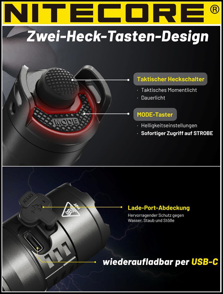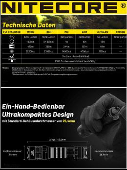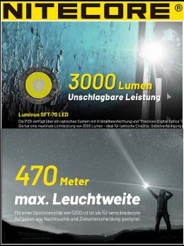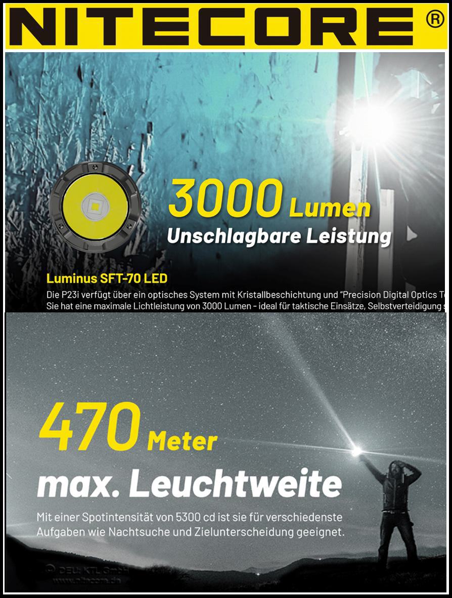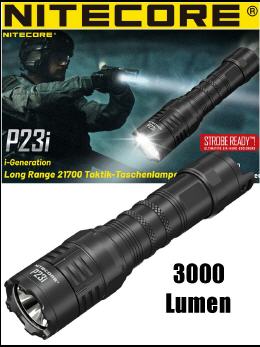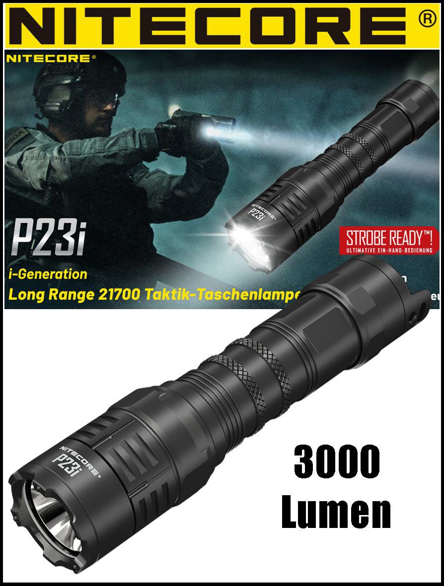 Die NITECORE P23i ist eine kompakte, leistungsstarke LED-Akku-Lampe mit unglaublichen 3000 Lumen Lichtleistung und einer enormen Leuchtweite von 470 Metern. Sie verfügt über 5 Helligkeitsstufen und einen Strobe- (Blitz)modus zur Selbstverteidigung. Durch den "STROBE-READY"-Schalter lässt sich der Strobe-Modus jederzeit sofort anwählen, damit der mögliche Angreifer blitzschnell geblendet und irritiert werden kann. Als Energiequelle dient der P23i ein NL2150HP Li-Ion Akku mit einer Kapazität von 5000mAh. Dies sorgt für eine Brenndauer im LOW Modus (250 Lumen) von ca. 10 Stunden. Aufgeladen wird der Akku über einen USB-C-Anschluss in der Lampe. Lieferung inkl. Gürtelholster, Akku & USB-C-Ladekabel, Halteclip , Handschlaufe.