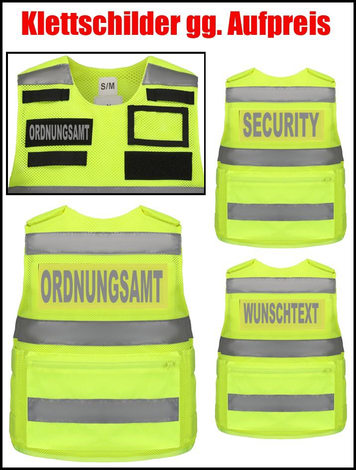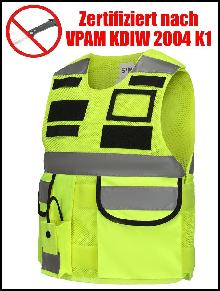 Die Signal Stichschutzweste vereint höchsten Schutz mit maximaler Sichtbarkeit. Ausgestattet mit den in Deutschland gefertigten zertifizierten Stichschutzeinlagen nach VPAM KDIW K1 bietet sie Sicherheit und Komfort bei gleichzeitig hoher Funktionalität. Durch das leuchtende Neon-Gelb und die umlaufenden Reflexstreifen ist die Weste auch bei schlechten Lichtverhältnissen optimal sichtbar. Mehrere Taschen und Klettflächen machen sie zu einem unverzichtbaren Begleiter für Bahnsicherheit, Ordnungsdienste und Security . Die Technik, mit der diese Stichschutzwesten hergestellt werden, ist innovativ und weltweit einzigartig. Nach intensiver Forschung ist es gelungen, ein Textil/-Kunststoffkomposit herzustellen, das zugleich sicher, leicht und flexibel ist. Bei der Entwicklung der Stichschutzweste diente das Gürteltier als Vorbild. Ähnlich wie bei diesem gepanzerten Säugetier, schützt eine sich überlappende, flexible Schuppenstruktur den Träger. Diese schützende Schicht besteht aus einem hoch festen Carbon-Glasfaserkomposit auf einem Aramid-Gewebe, das ein hohes Maß an Sicherheit in Kombination mit höchster Flexibilität bietet. Außerdem schützt das Material der zertifizierten Weste sehr effektiv gegen Stumpfe Gewalt wie Schläge oder Tritte. Außerdem können wir durch unsere flexiblen Stichschutzeinlagen einen deutlich größeren Bereich abdecken als die meisten anderen Westen. Bei der Signal Stichschutzweste überlappen die Schutzzonen an der Seite, so dass Sie rundum geschützt sind. Die auffällige Hülle in Neon-Gelb mit breiten Reflexstreifen sorgt für maximale Sichtbarkeit bei Tag und Nacht - ein entscheidender Vorteil für alle Berufsgruppen, die in gefährdeten oder unübersichtlichen Bereichen arbeiten. Für maximale Funktionalität verfügt die Weste über mehrere Taschen und Klettflächen, die Platz für Ausrüstung wie Funkgeräte, Bodycams, Ausweise oder Patches bieten. Eine große Tasche auf der Rückseite ermöglicht das Mitführen von zusätzlichem Material. Das robuste, atmungsaktive Mesh-Gewebe reduziert Wärmestau und sorgt für hohen Tragekomfort, selbst bei langen Einsätzen. Sowohl an der Vorder- wie auch an der Rückseite befindet sich eine Klettfläche auf der Klettschilder (gegen Aufpreis) befestigt werden können. Lieferbare Aufschriften gegen Aufpreis: "ORDNUNGSAMT" , "SECURITY" oder Ihrem individuellem "WUNSCHTEXT". Das Schutzmaterial in der Weste kann einfach entfernt werden. So kann das Obermaterial einfach in der Waschmaschine gewaschen werden, um eine Reinigung zu gewährleisten.